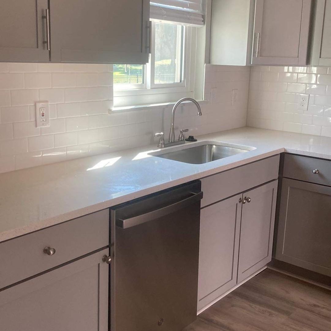 • Quartz countertops in the kitchen with a beautiful tile backsplash. Including quartz countertop on the bathroom vanity and faucets.